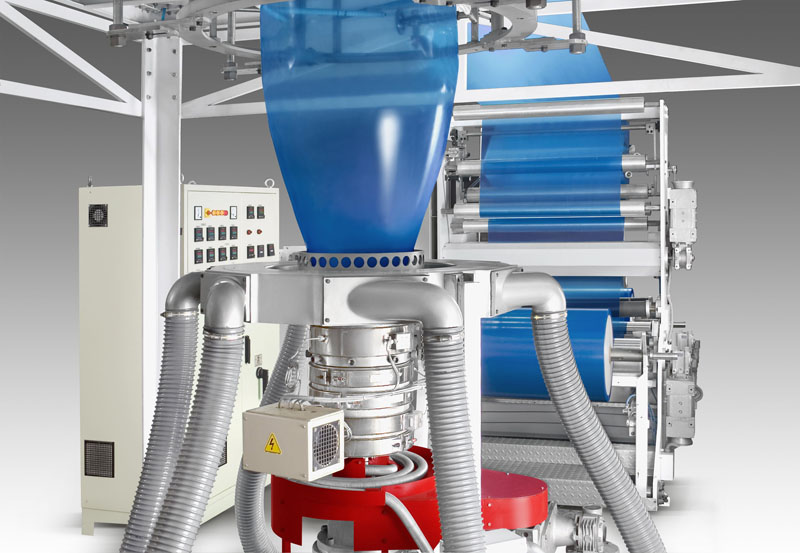 - Manejo del ancho y espesor de la película mediante el control del volumen de aire en la burbuja, de la salida del extrusor y de la velocidad de arrastre
