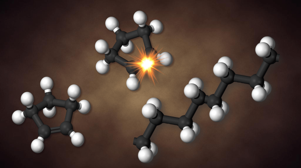Se trata de un desarrollo relativamente nuevo en la química de los polímeros es la polimerización de monómeros cíclicos tales como el ciclopenteno en presencia de catalizadores que contienen metales tales como tungsteno, molibdeno y renio. La acción de estos catalizadores produce polímeros lineales que retienen los dobles enlaces carbono-carbono que estaban presentes en el monómero.