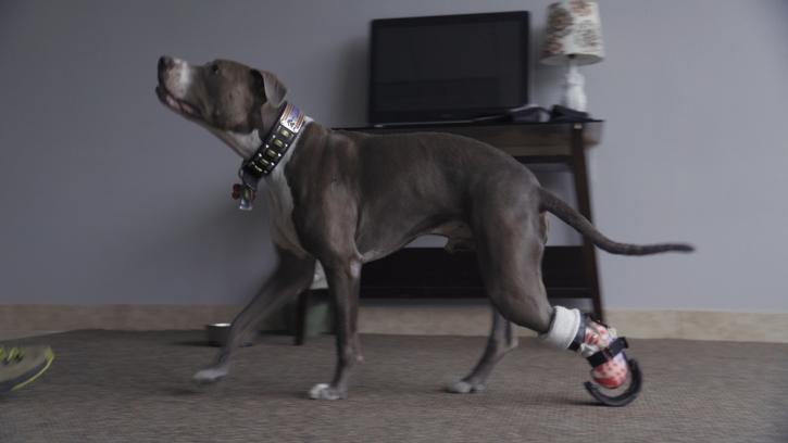 Como en el caso de Hudson, una mezcla de pitbull de 4 años de edad. Hudson como muchos perros, fue abandonado de cachorro y se lastimó las patas en las vías del tren en Nueva York perdiendo una de ellas.