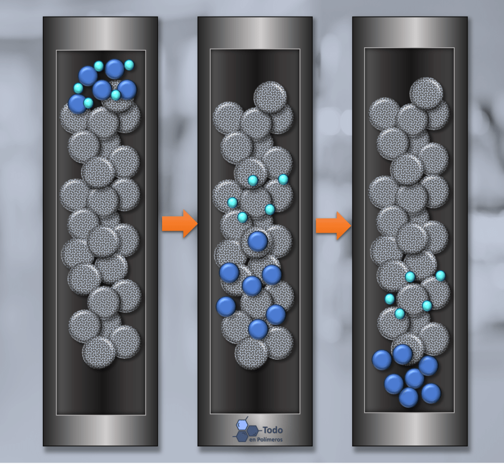 Las partículas más pequeñas del material analizado pueden ingresar a los poros más fácilmente y, por lo tanto, pasan más tiempo en estos poros, lo que aumenta su tiempo de retención. Estas moléculas más pequeñas pasan más tiempo en la columna y, por lo tanto, eluirán en último lugar. Por el contrario, las partículas más grandes pasan poco o ningún tiempo en los poros y se eluyen rápidamente. Todas las columnas tienen un rango de pesos moleculares que se pueden separar.