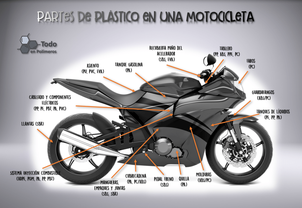 Hoy en día, aunque el marco y otras piezas son de acero y otras aleaciones metálicas, las motocicletas tienen un alto contenido de piezas hechas en plástico, casi todos estos, polímeros de ingeniería con alta resistencia mecánica (al impacto), térmica y hasta química en muchos casos.